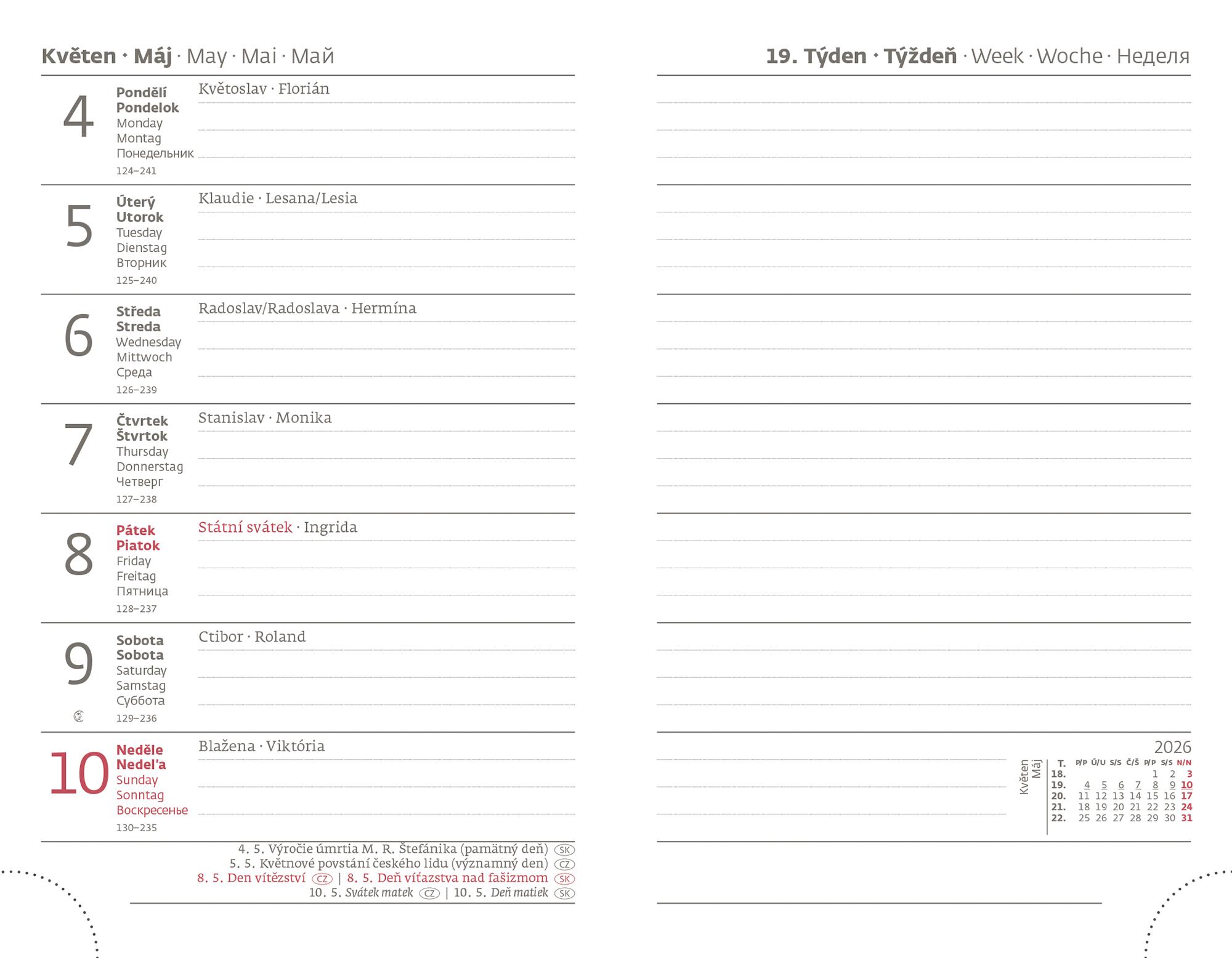 Diář obsahuje: osobní údaje, plánovač dovolené (měsíční přehled), plánovací kalendář, mezinárodní svátky, roční výhled, týdenní layout, adresář