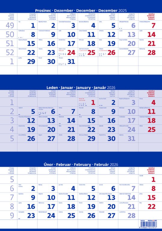 Kalendárium: české tříměsíční s poznámkami, jmény a se svátky vybraných evropských států (CZ / SK / A / B / D / F / H / CH / I / PL / RUS / UKR)