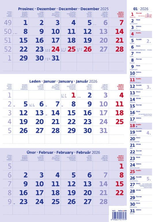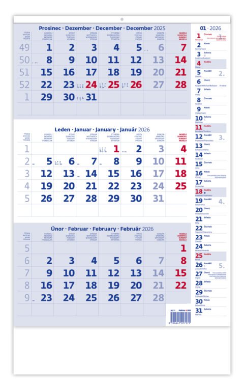 Tříměsíční kalendář modrý s poznámkami 2026Vyrobeno v ČR