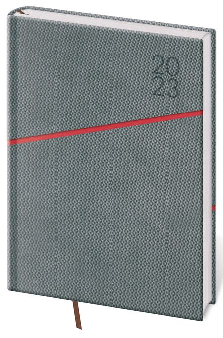 Desky diáře jsou vyrobeny převážně z šedé matné a strukturované koženky. Šedá koženka je ozdobena barevným pruhem.